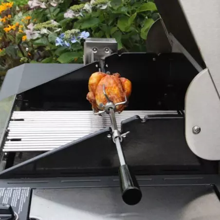 Rôtissoire équipé d’un moteur 220 volts et de 2 pics lardoires pour bien maintenir la pièce à rôtir.